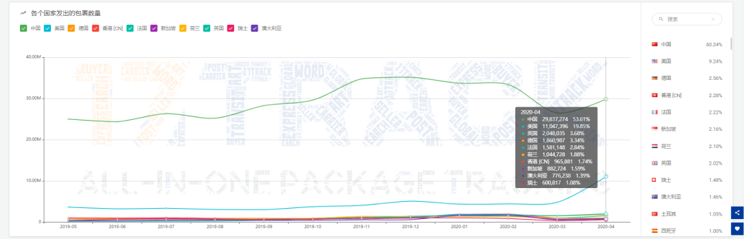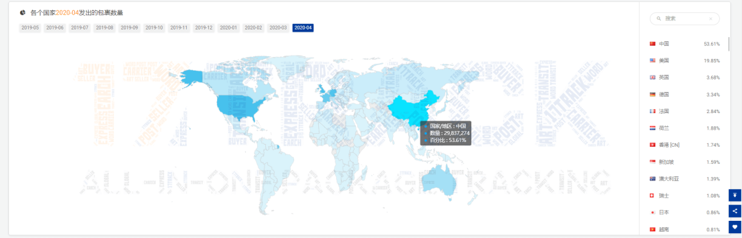 2020年4月,平台总共收录查询单号超过5,566万票,其中发件的国家及地区为217个、收件的国家及地区为226个。
