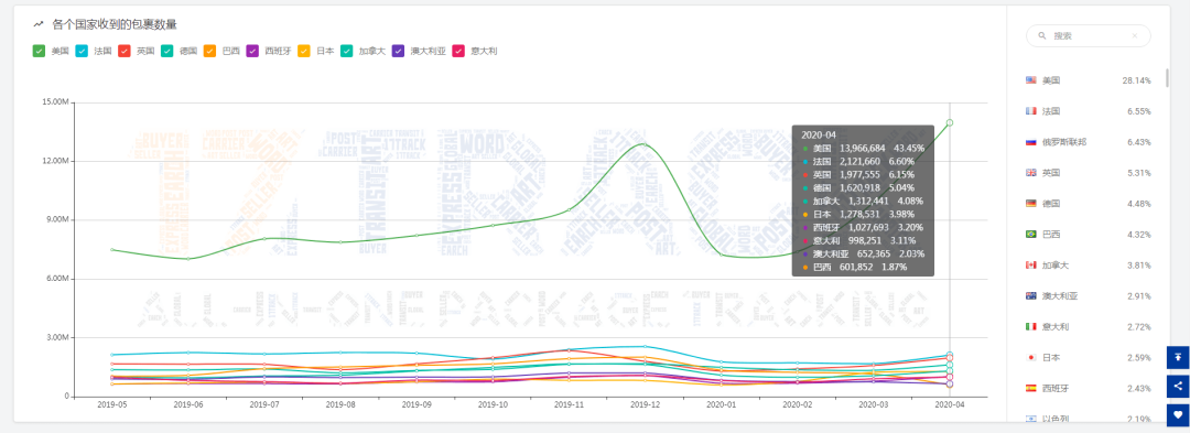 本期咱们一起回顾一下4月份的包裹数据:环比可以看到,4月份各个国家发出的包裹数量较3月份增加了1,200万、涨幅达到了27.3%;同比增长更是非常的明显,增加了1,700万、涨幅高达43.6%;虽然目前全球的疫情仍较为严峻,但就2019年与2018年同比增长600万、涨幅18.2%相比,今年的数据还是异常的夺目。