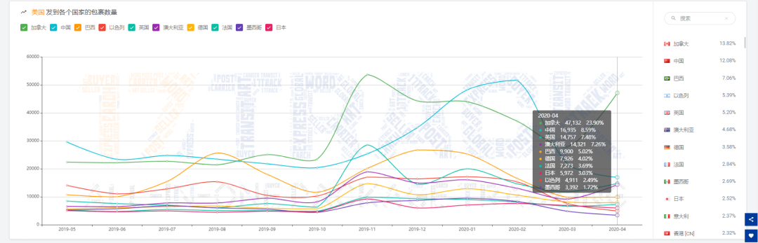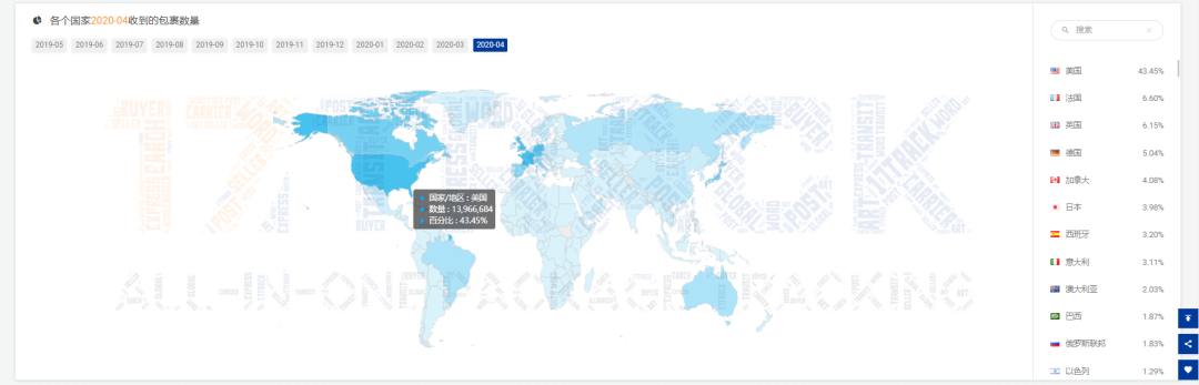 注:中国邮路发出的包裹,较3月份有所增加,其中收件排列前三的国家分别是美国占47.50%(过去12个月的新高)、英国占6.58%、法国占5.44%;俄罗斯及巴西则持续下降