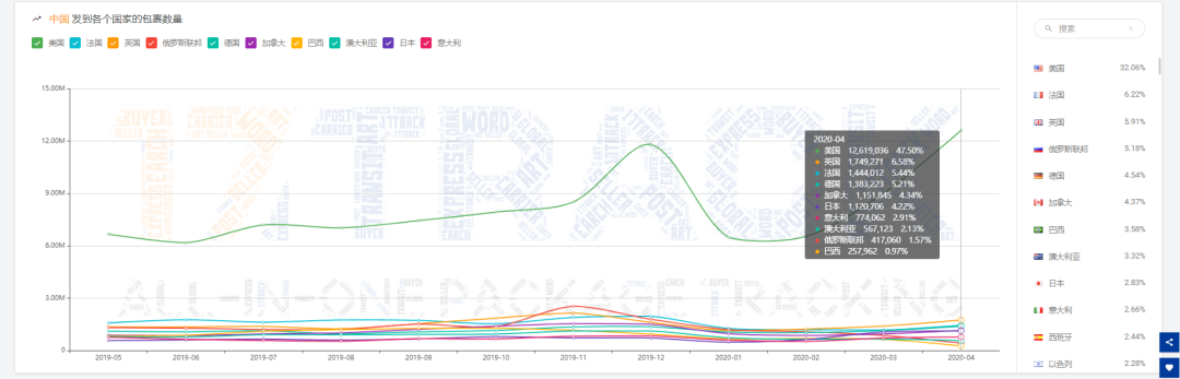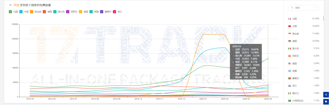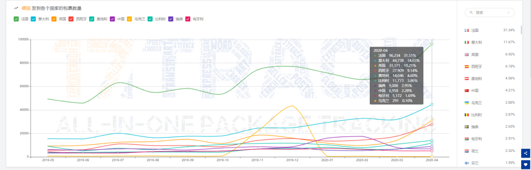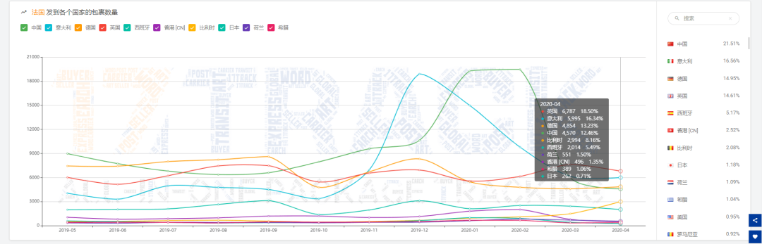 注:法国邮路发出的包裹,较3月份提升明显,创下了过去12个月里面的新高,其中发往数量排前三的国家分别是英国、意大利、德国