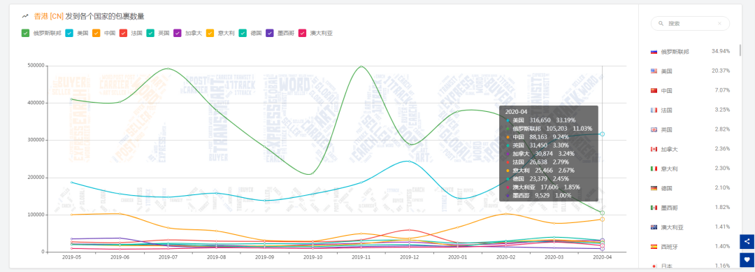 注:中国香港邮路,继3月份首次出现俄罗斯与美国的趋势线交替,4月份则持续扩大差距,发往俄罗斯的数量持续减少,发往美国的数量则持续增加