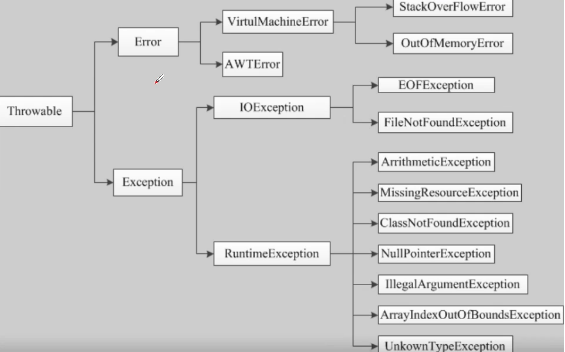 - 错误不是异常,而是脱离程序员控制的问题。错误在代码中通常被忽略。如:当栈溢出时,一个错误就发生了,它们在编译时也检查不到。