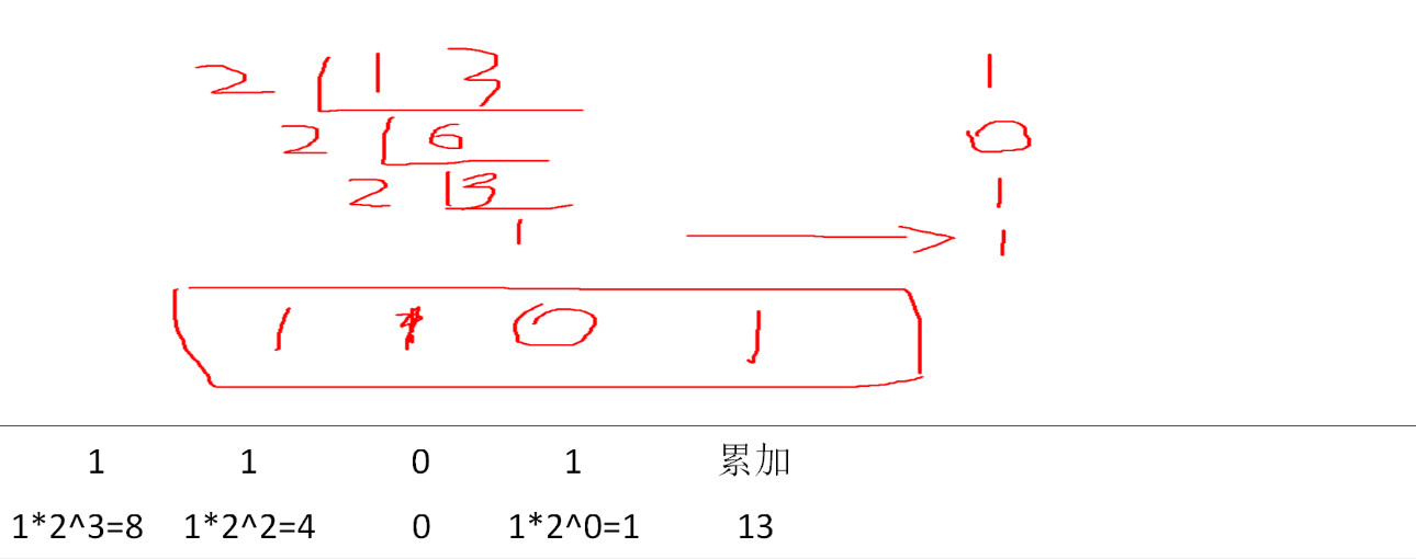 累加 1x2^3=8 1x2^2=4 0x2^1=0 1x2^0=1 13