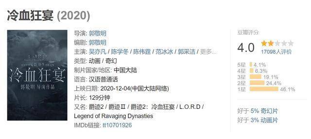 12月4日,《爵迹2:冷血狂宴》正式在腾讯视频上线,《冷血狂宴》播出一天后豆瓣开画4.1分,之后降至3.9分,目前评分略微回升至4.0分,现共有1.7万人进行评价,其中46.1%的网友为其打出1星差评(接近7900个差评)。
