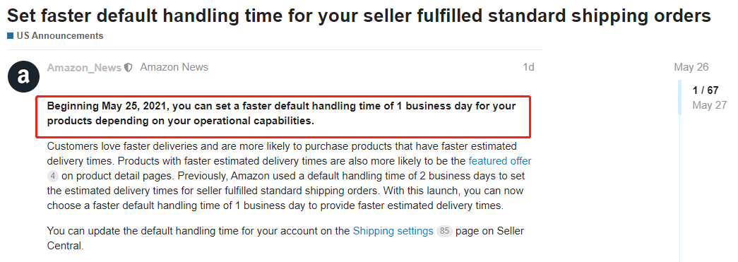 点击蓝字→右上角设置星标★,跨境干货不错过5月27日消息,日前,亚马逊美国站公告称,从2021年5月25日开始,卖家可以根据自身的运营能力设置一个更快的默认处理时间,即1个工作日。亚马逊表示,顾客喜欢更快的交付,更有可能购买预计交付时间更快的商品。以前,亚马逊使用2个工作日的默认处理时间来设置卖家完成标准发货订单的预计交付时间,通过本次调整,卖家可以选择1个工作日的默认处理时间,以提供更快的预计交