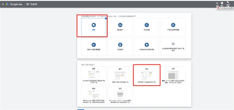 点击左边的广告系列层级,增加新广告系列,目标选择销售,广告系列类型选择购物