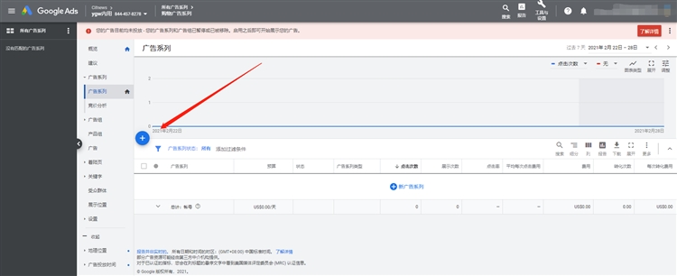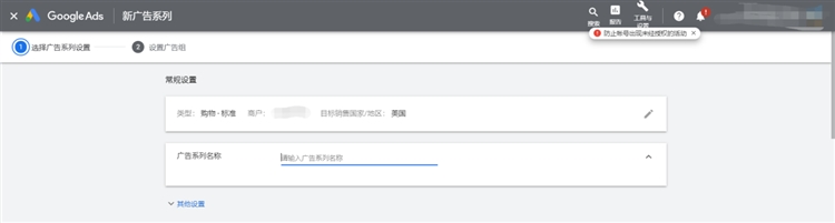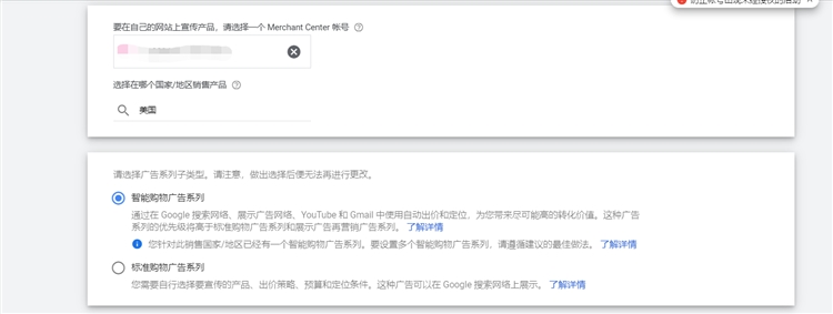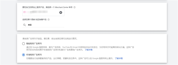 可以看到已经关联的merchant center账号,同时因为还没有转化数据积累,所以还不能选择智能购物广告系列,直接勾选标准购物广告系列