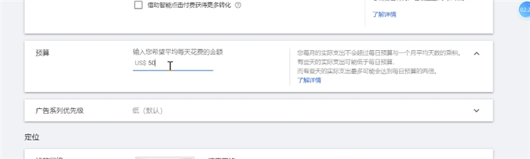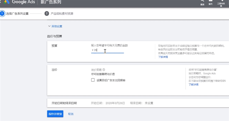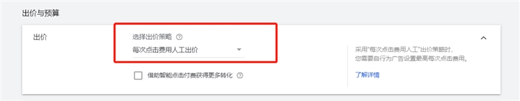 选择一个出价策略,对于新账户还没有数据累积时,建议选择每次点击费用人工出价且不勾选智能点击费用获得更多转化(因为谷歌的智能功能都需要一些历史累积数据来学习)