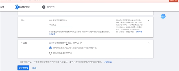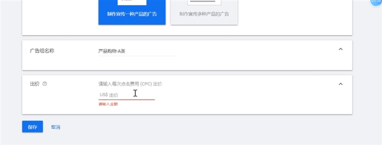 选择创建产品购物广告,输入广告组名称与每次点击费用出价,可以参考关键字规划师