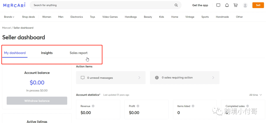 煤炉(Mercari)好不好做,怎么做?相信一千个卖家就会有一千个声音。每一个平台都有这个平台的特点以及优劣势。今天小付哥和大家一起来看看煤炉需要怎么操作来赚钱!煤炉的后台非常非常简单,也是买卖同号的一个平台。一个主要以二手商品交易的C2C平台,平台的流量非常大,算法是置顶推新机制,所以说运营出单效果非常明显,基本上商品从上架到出单不出三天。熟悉后台上架商品点击右上角的sell即可,典型的买卖同号