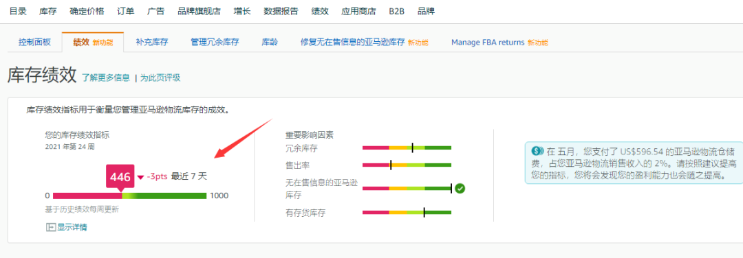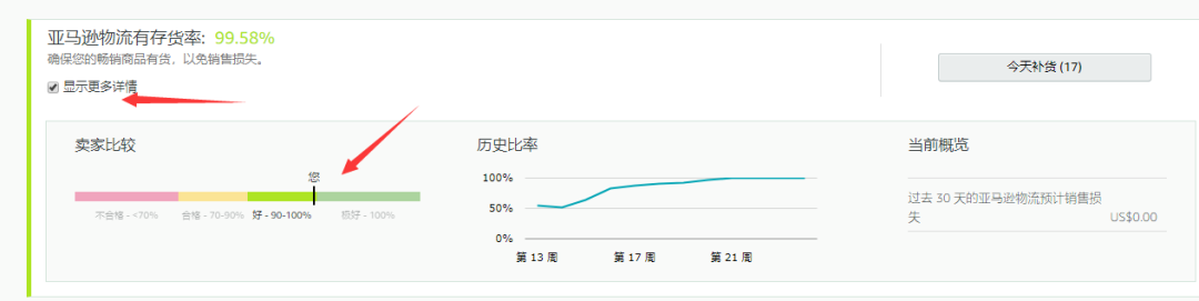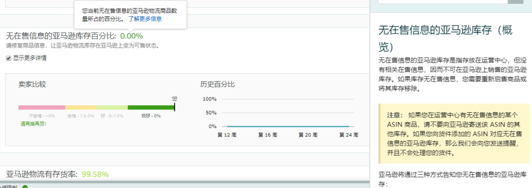 这个分值越高,处于最右边蓝色位置的话你做亚马逊手里就可以看到盈利的资金接着是第三个指标:无在售的亚马逊库存如图: