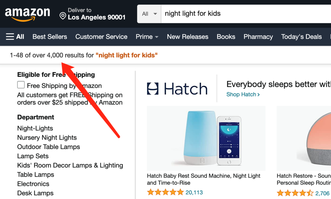 1、 对比"night light for kids"和"night light for children"这两个近义词的搜索结果。如下图,可以看到搜索结果数有着很大的差别。