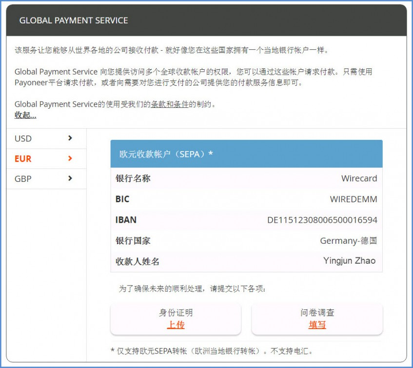 选择EUR,页面中显示的就是你的欧元收款账号信息。