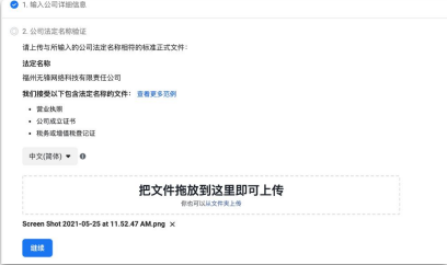 3. 在下一页面确认验证公司详情的准确性并上传要求提供的文件
