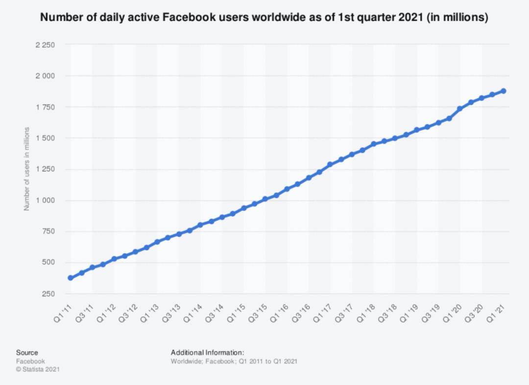 什么是 Facebook Ads ?为什么人们选择 Facebook Ads ?每位跨境电商独立站商家都知道,Facebook 是社交媒体——这意味着该平台的「社交属性」大于消费「购物属性」。其搜索量当然不比 Google,但 Facebook 拥有全球社交网络中最高的月活跃用户量(MAU)——超过 25 亿,日活量也相当惊人(见下图),人群需求广泛、强社交属性意味着粘性和说服力更高。品牌独立站商家依然可以用 Facebook Ads 触达目标消费者。