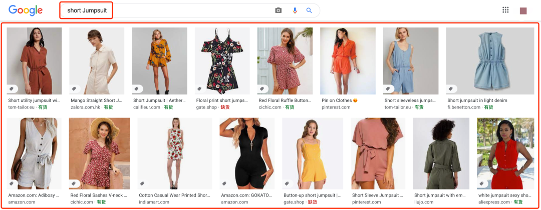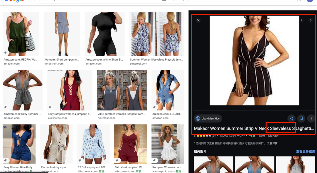 Q:什么样的词能够被定义为核心关键词?A:最能描述产品、与产品相关性最强,且搜索量相对较大的词就可以定为核心关键词。Q:如何找到这个核心关键词?A:卖家的独立站内部对产品的描述、搜索产品时对产品最合适的描述。本文以下图「吊带连衣裤」为例(假设市场定位:美国;语言定位:英语),教你一套制作关键词的流程;Step 1 通过 Google 图片对产品描述【Sexy Halter Lace-Up Pile Neck Suspender Jumpsuit】进行搜索,发现搜索结果与产品本身匹配度并不高,说明还需要有更精准的描述;