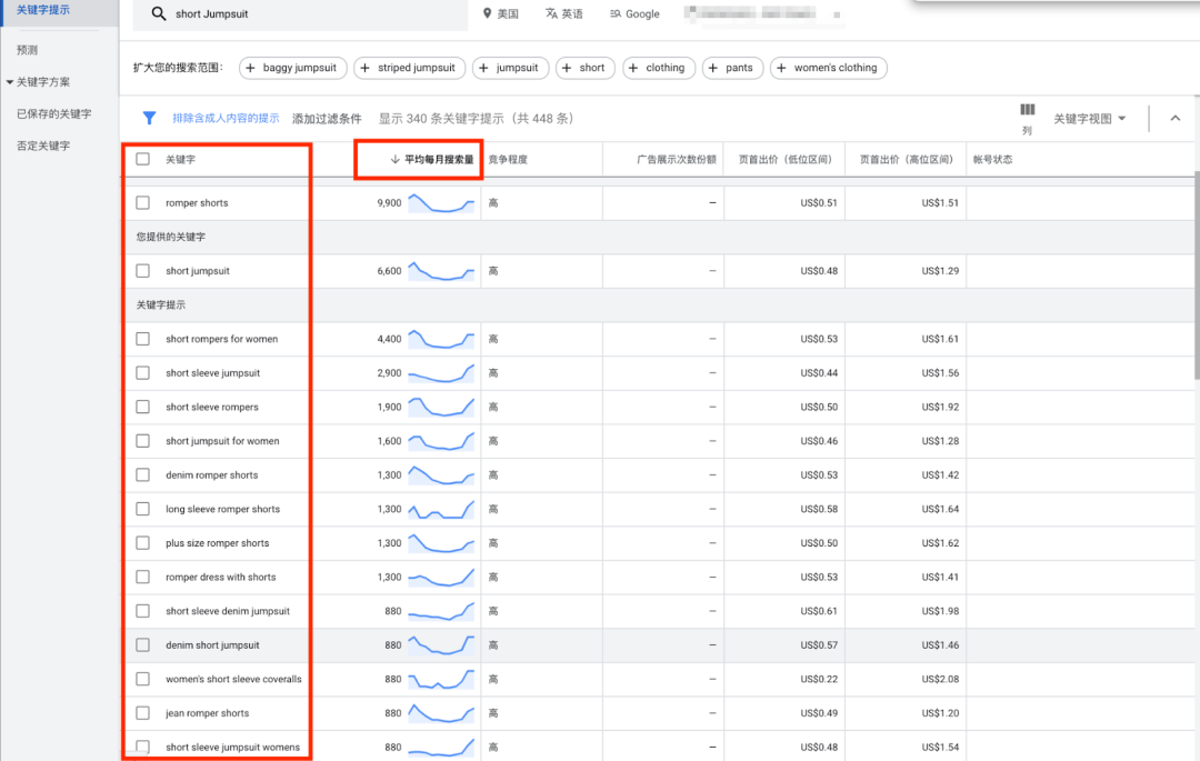 提炼优质关键词利用 Google Ads 关键词规划师查看组合关键词的数据情况,筛选出搜索量高的词。