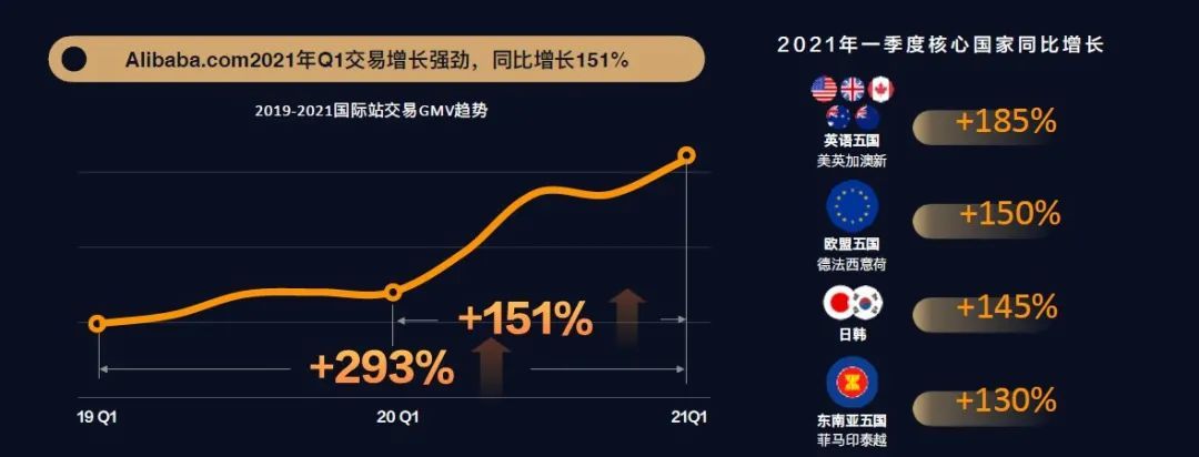 今年第一季度交易额相比去年和前年的增长,分别达到了惊人的151%、293%;今年4月至今的交易额同比增长88%;一季度核心买家国交易额的增长,最高达到了185%!