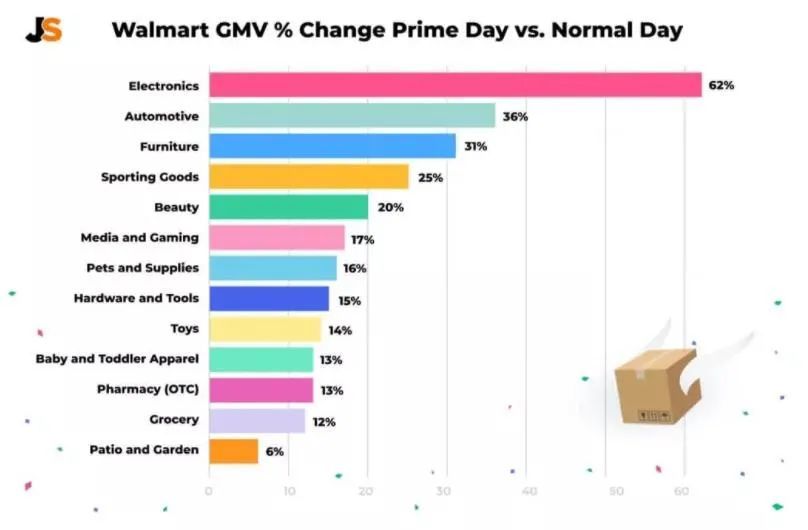与沃尔玛的正常销售日比,电子产品的GMV高出62%,汽车类别的GMV 高出 36%,家具类别高出 31%,运动装备高出 25%,美妆类别高出20%。此外,传媒与游戏、宠物用品、硬件工具、玩具、婴幼儿服装等增长也都超过了10%。