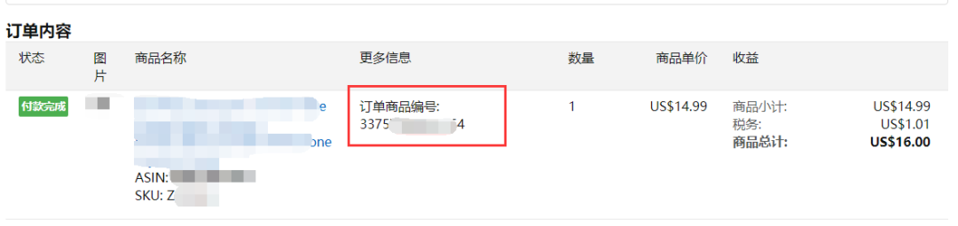 - Amazon-order-item-code:非必填项。产品的编码,14位数的。可以在订单详情里找到,单仅限美国站,如下图。