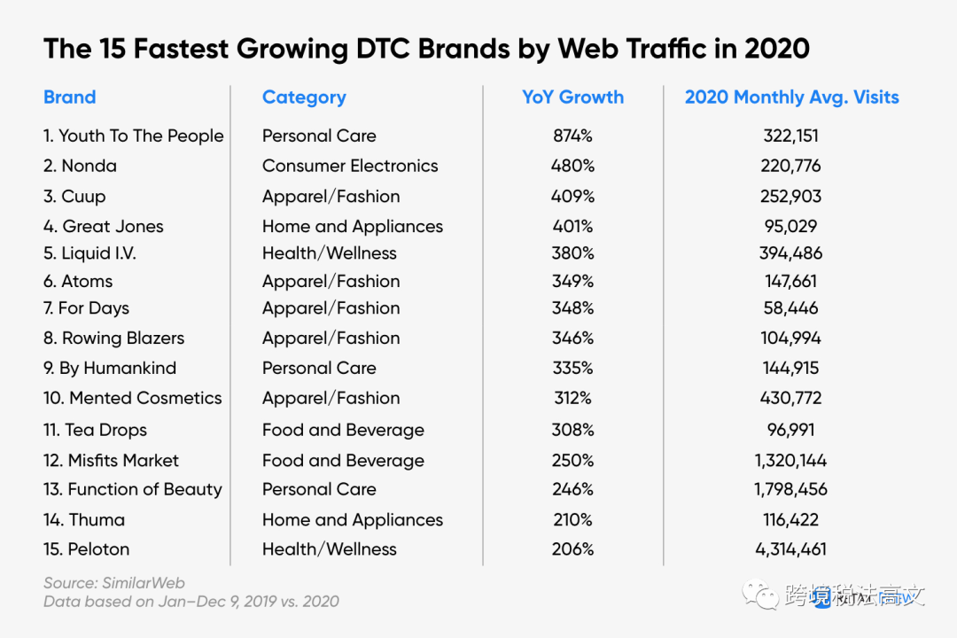 众所周知,2020年,是全球电商崛起的一年,不少卖家和DTC品牌都迎来了流量爆发。在此基础上,SimilarWeb对流量增幅最大的前15个DTC品牌进行了盘点,而上图展示的就是这15个平台。