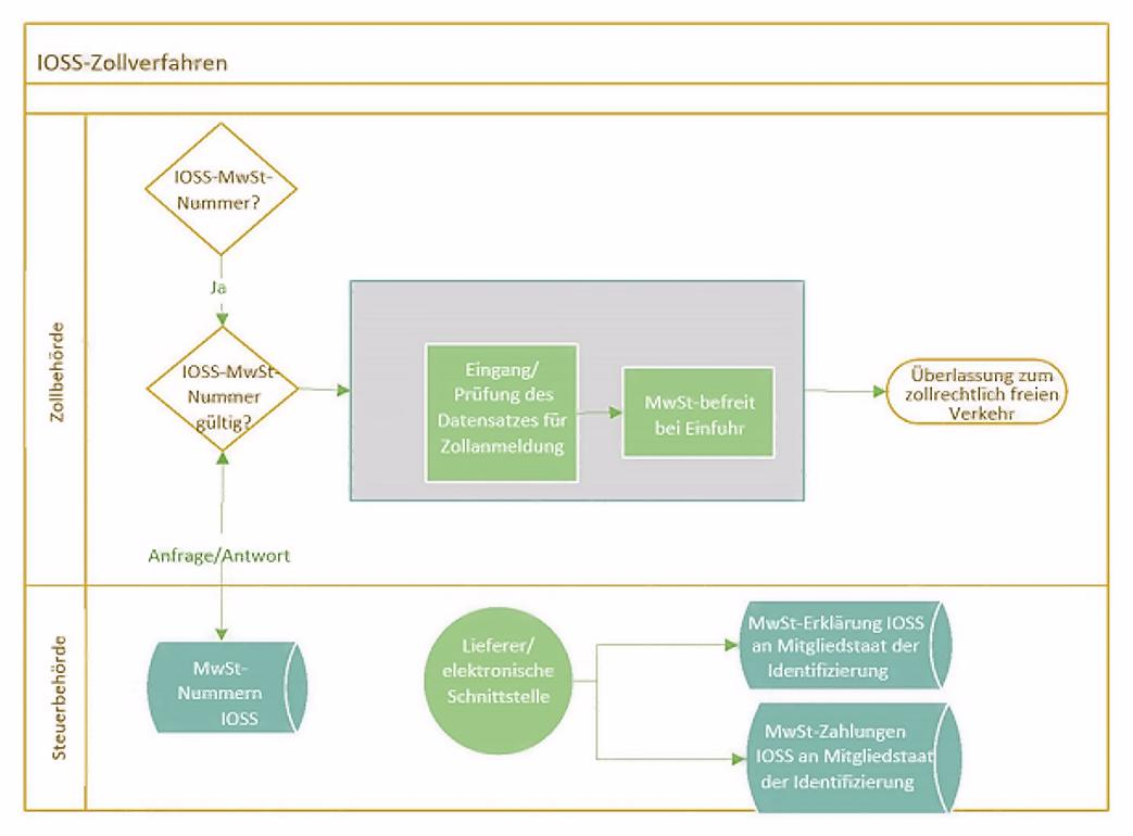 当清关行清关时,海关先审查清关行是否在清关单中填写了一个 IOSS 税号,如果没有,那么就使用特别程序,前往到货国海关清关,交税清关。