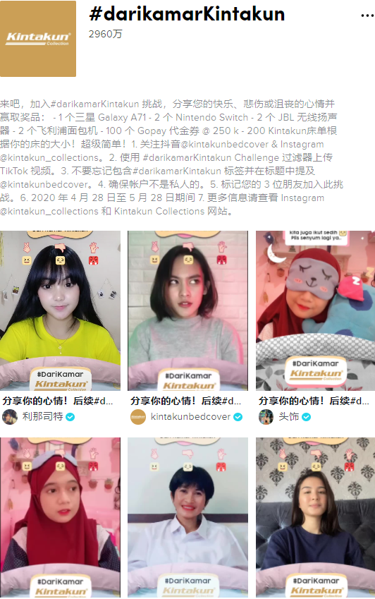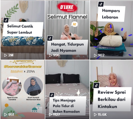 该品牌大多数邀请自己本土(印度尼西亚)的KOL进行视频内容的创作,通过与床品的一些创意互动,很好地展现出床品的柔软舒适性,打造出属于Kintakun风格的床品的柔韧性!