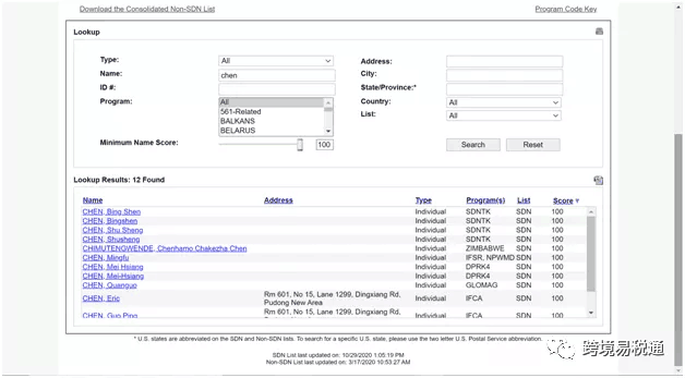 其实被封是很容易的,大家请看下图中,OFAC网站查出来的SDN名单。我简单的用Chen这个大姓来搜索,出来了这些被封禁的人名。