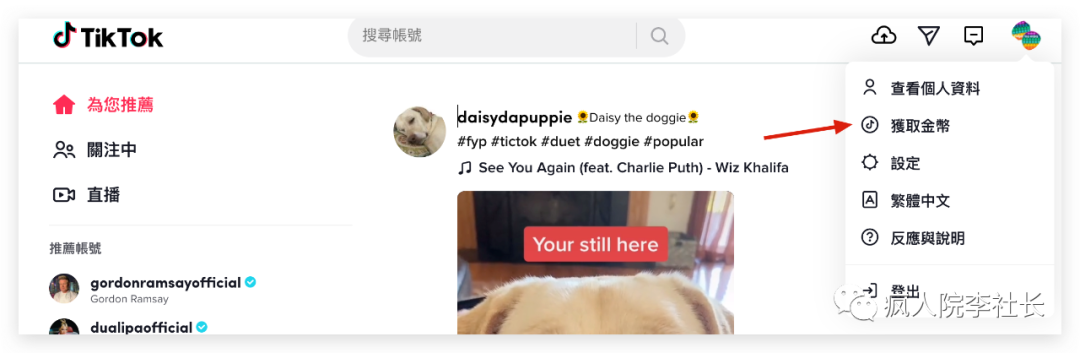 2、谷歌浏览器打开tiktok.com,登录英国账号,如果第1步线路正常的话,你会在右上角账号菜单里看到"获取金币"的菜单。看到的话恭喜你,人品不错,可以直接跳到第5步操作。