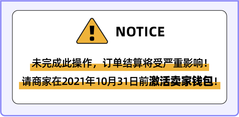 为了确保平台的收款、结算服务符合PSA合规标准(配合新加坡金管局出台的"支付服务法案"(Payment Services Act 2019,PSA)的要求),平台再次呼吁所有跨境中国商家朋友务必在2021年10月31号之前完成钱包的激活。若您未在规定时间内完成钱包激活,您从11月起的订单结算将受影响,无法收到平台打款。