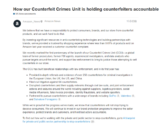 而在亚马逊提供的(CCU)今年的打假工作成果中,第一点就提到了,为欧盟、英国、美国和中国的刑事调查提供了超过250名造假者的深度推荐和证据;且还对其中的64名造假者提起了民事诉讼。