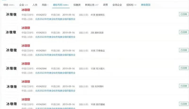 北京2022年冬奥会和冬残奥会组织委员会已于2019年9月申请注册"冰墩墩"商标,并于2020年12月注册成功。