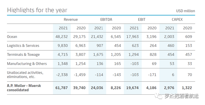 马士基集团日前公布2021年财报,一时引起业界热议。240亿美金的EBITDA(税息,折旧及摊销前利润)让人咋舌。前些年航运市场好的时候,作为业界老大哥的马士基集团每年的利润一般在20-30亿美金左右,已经是业界最赚钱的公司之一,结果去年一年的利润相当于过去连续10年的好光景,前无古人是真,后无来者未必。