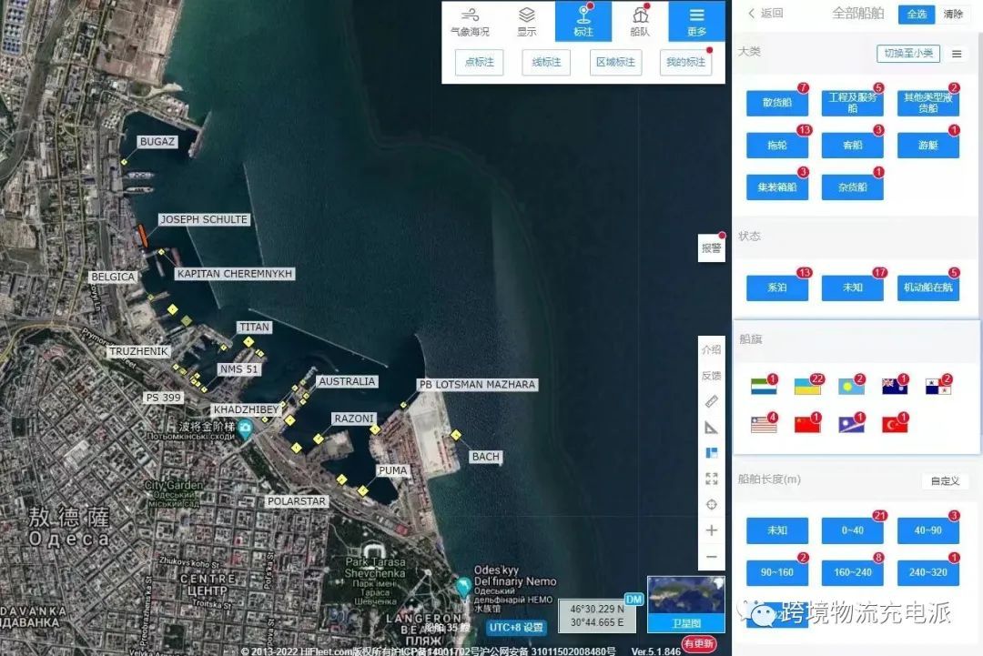 HiFleet 预抵船舶显示,多艘计划前往敖德萨的船舶已紧急调整航线在乌克兰水域外抛锚等待。