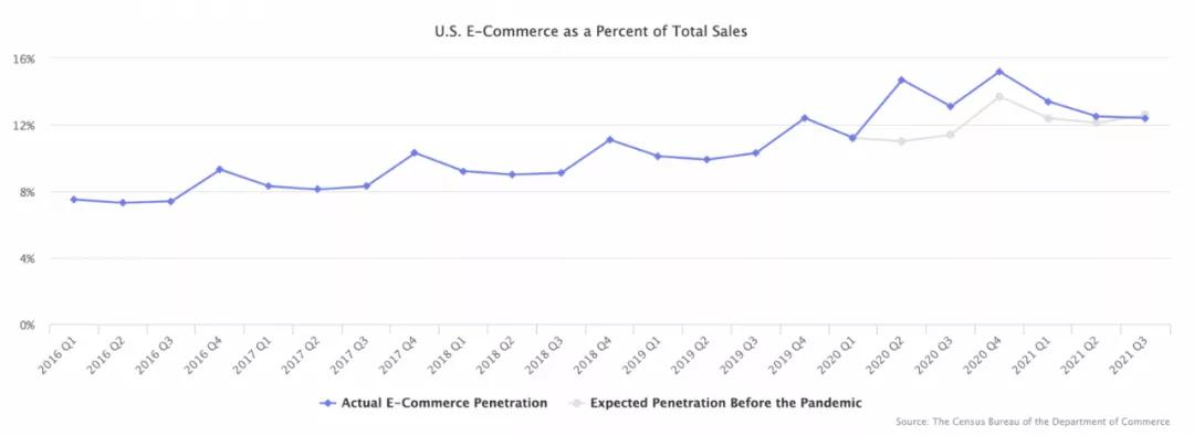以美国市场为例,2020年疫情初期电子商务占零售总额是超预期的,而随着2021年进入后疫情时代以来,电子商务占零售总额逐渐走低并归于预期值。
