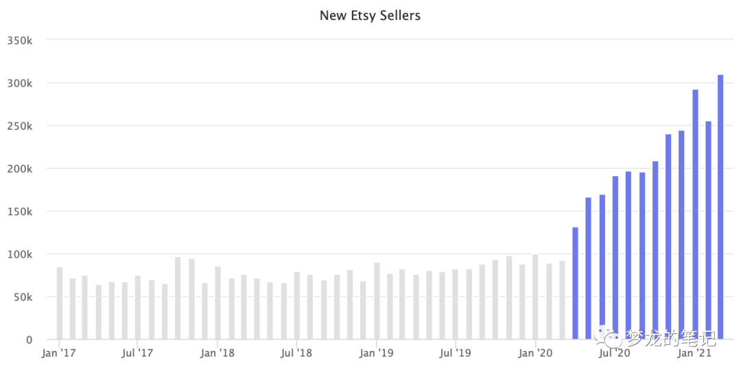 根据 Marketplace Pulse 的研究,Etsy 每月新增超过300,000 名卖家。在大流行前的三年中,平均增加了大约 100,000 人,这一数字自 2017 年初以来一直保持稳定。它在 2020 年 4 月开始加速,到 2021 年 4 月,它达到了之前数字的三倍。