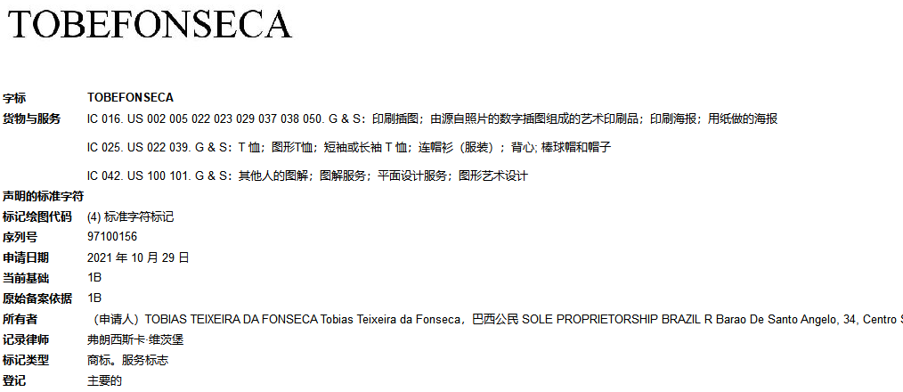 Tobias Teixeira Da Fonseca作品注册了一个文字商标TOBEFONSECA和数十个版权,都需要卖家各位注意。