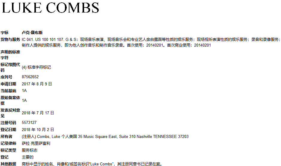 Luke Combs是注册商标,在服装,现场表演以及音乐录音等方面都不能使用。