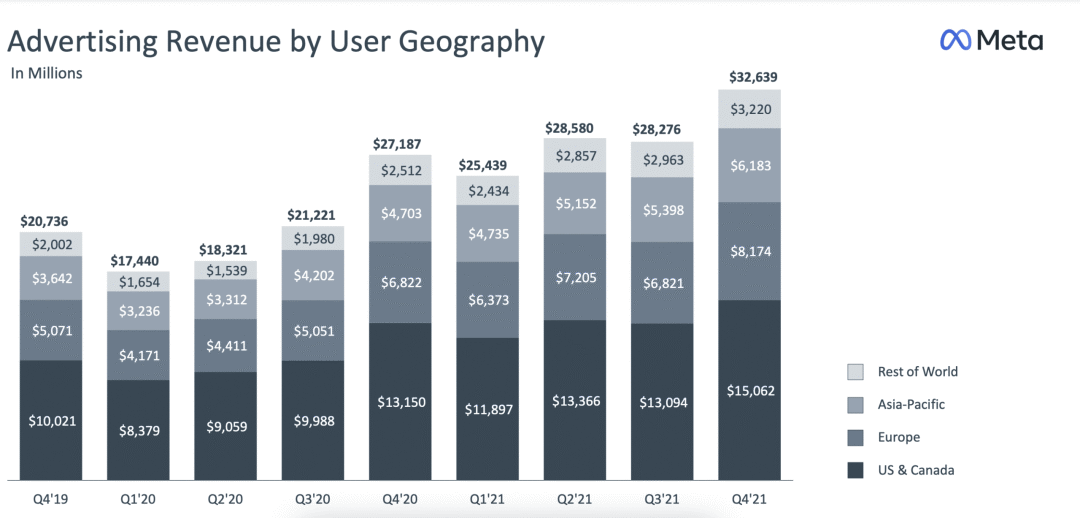 2021 年第四季度,Meta 的 150 亿美元广告收入来自美国和加拿大,另外 81 亿美元来自欧洲,61 亿美元来自亚太地区,32 亿美元来自世界其他地区。在 Facebook 上制作广告活动时需要考虑的事项。