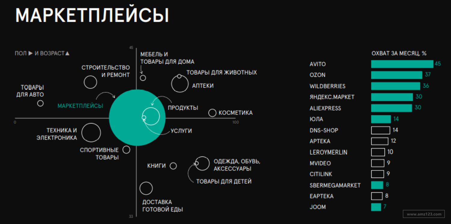 4月份俄罗斯线上买家最常网购的平台分别是:Avito(占45%)、Ozon(占37%)、Wildberries(占36%)、Yandex.Market(占30%)和Aliexpress(占30.............