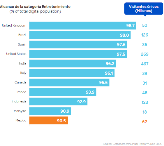但是,在墨西哥线上娱乐人群的独立访客数量高于欧洲国家。墨西哥数字人群的娱乐类别范围为 90.5%,低于英国(98.7%)和法国(93.9%)等国家。