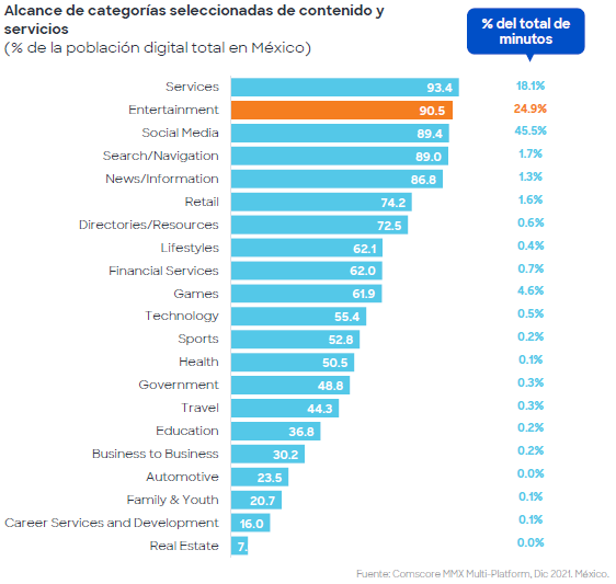 与其他用户使用在线活动相比,用户在休闲和娱乐上面的热爱程度在墨西哥国的重要性显而易见。娱乐 (90.5%) 的表现优于社交网络 (89.4)、新闻/信息 (86.8%)、零售 (74.2%) 和资源 (72.5%) 等非常受欢迎的类别,其中涉及目录、推荐、地图、分类广告、邮件/发货跟踪、黄页和白页、电子邮件和网络目录、字典、百科全书和年鉴。唯一高于休闲的垂直领域是服务(93.4%)。