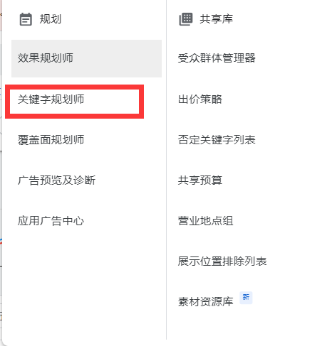 关键词规划师是常用的也是大家非常熟悉的,在投放Google广告前,也是获取关键词的搜索量,出价,变化情况,竞争程度,页首高低位区间出价等情况,关键词规划师就在Google ads的工具与设置里面--关键词规划师。关键词规划师也是我投放facebook设置兴趣爱好词的时候一个很重要的来源。