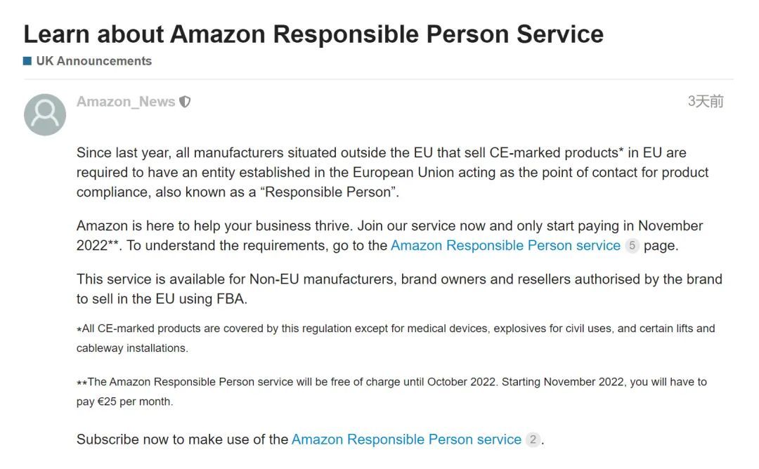 欧盟在2019发布的相关法规中,要求所有位于欧盟以外的制造商在欧盟销售带有CE标志的产品时,都必须在欧盟设立一个产品合规联络点,也称为"责任人"。这个责任人不是白设的,如果产品出现质量或者违反合规内容的问题,如果联系不上卖家可是要找这个责任人麻烦的,亚马逊居然愿意自己承接这个麻烦事还真是挺稀奇。之前亚马逊就因为不想担责.............