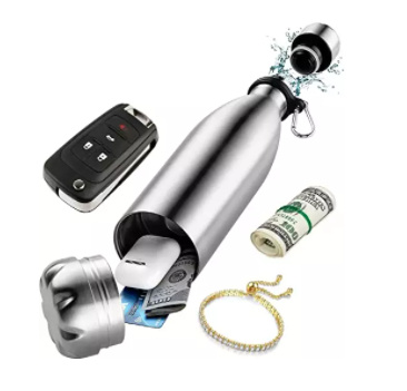 这款水杯材质为不锈钢,底部含有隐藏式隔层,除了储藏饮用水的功能之外,其还支持旅行者将卡片、钥匙、现金和其他贵重物品藏在水杯中。