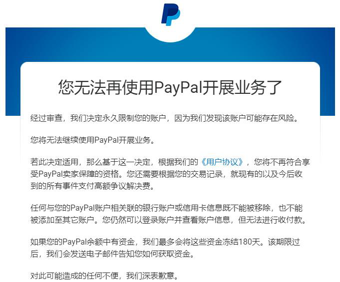 就在上个月月初,深圳一家跨境企业接连两个PayPal账户被封停,11万美金被冻结,仅剩的最后一个PayPal账户也将存在关联风险。尽管该公司找到PayPal沟通近一周,但无济于事。最终这家公司资金链断裂,老板不得不关停公司,遣散员工。