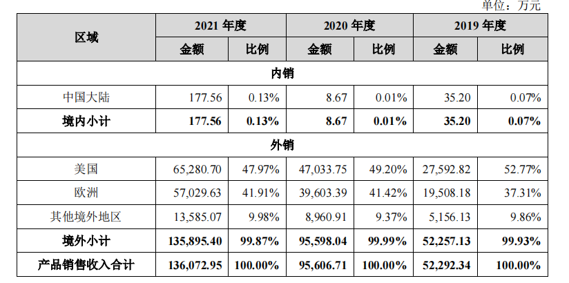 2021年美国市场(6.5亿元)与欧洲市场(5.7亿元)合起来的营收,占比达到90%,来自国内的营收只有177万,占比仅为0.13%。