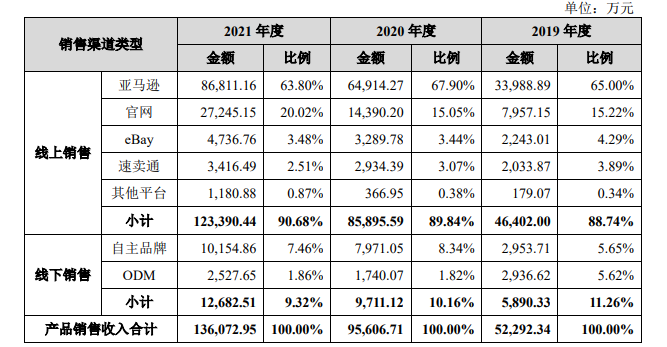 亚马逊是线上收入的主要渠道,连续三年的销售收入为3.4亿元、6.5亿元、8.7亿元,占比非常大,分别达到65%、68%、64%。