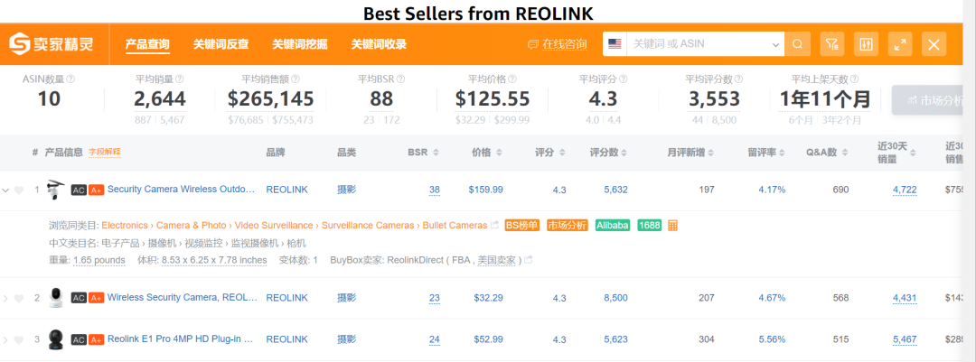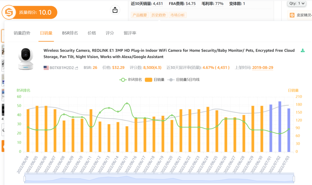 根据卖家精灵SellerSprite.com的数据显示,睿联一款售价79.99美金的摄像头,质量得分为10.0,30天销量达4331件, 留评达到有8500条。