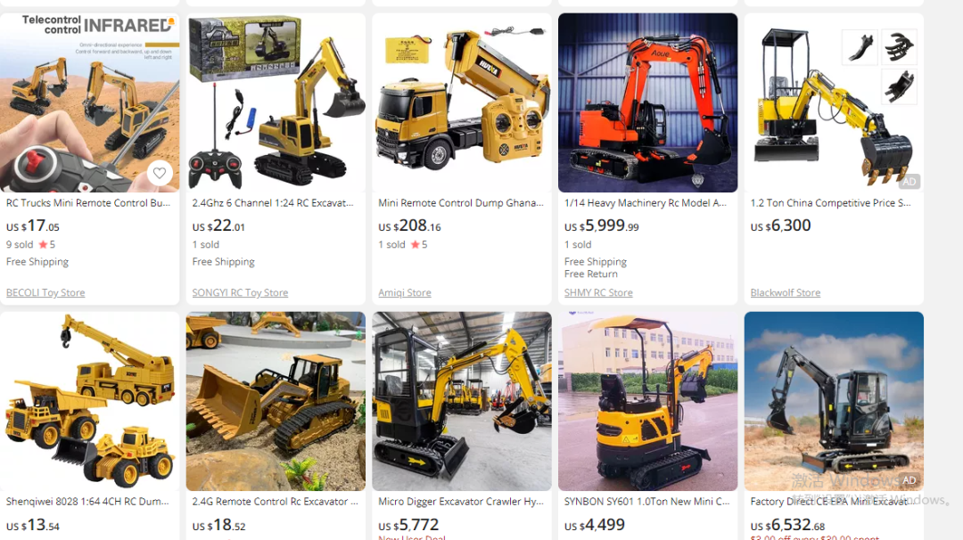 雨果跨境搜索速卖通平台发现,速卖通上微型挖掘机的相关listing不在少数,售价在200美元-6000美元不等。